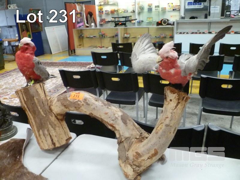 PAIR TAXIDERMY GALAHS, MOUNTED ON LOG