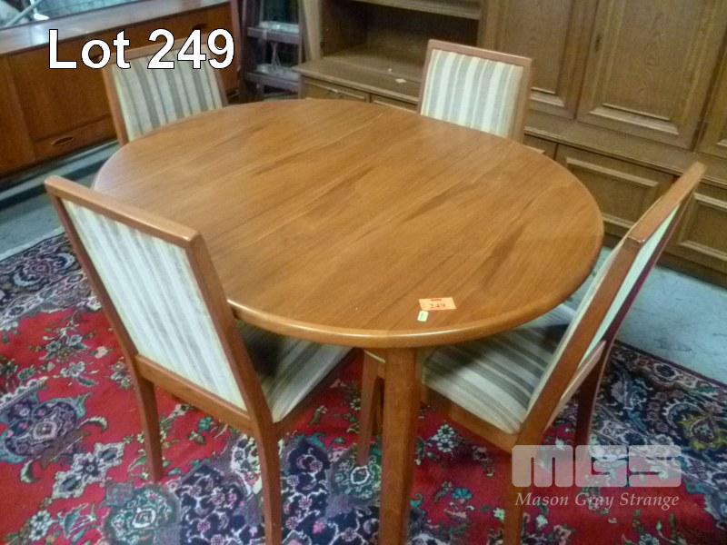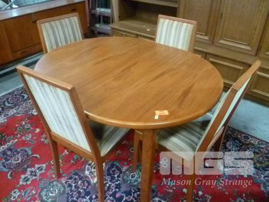 RETRO TEAK 5 PIECE DINING SUITE, GOLD & BEIGE STRIPED VELVET CHAIRS
