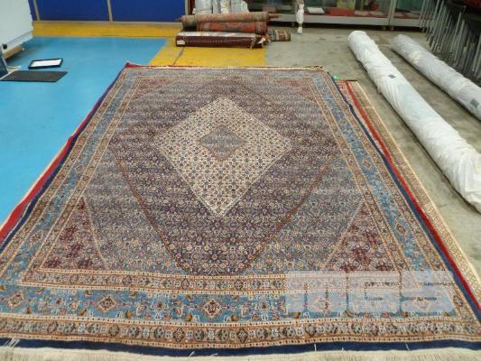 ORIENTAL CARPET, WOOL HAND KNOTTED, BLUE GEOMETRIC CENTRAL FIELD, 3.3 x 2.1m (APPROX)