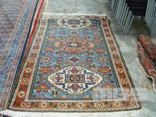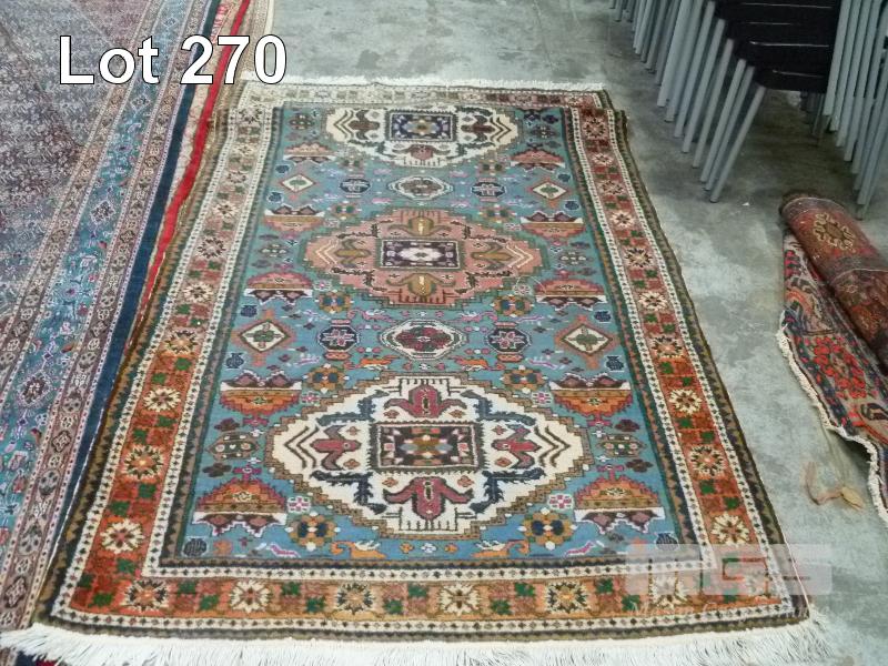 ORIENTAL HAND KNOTTED WOOL RUG, GEOMETRIC BLUE FIELD, 2 x 1.4m (APPROX)