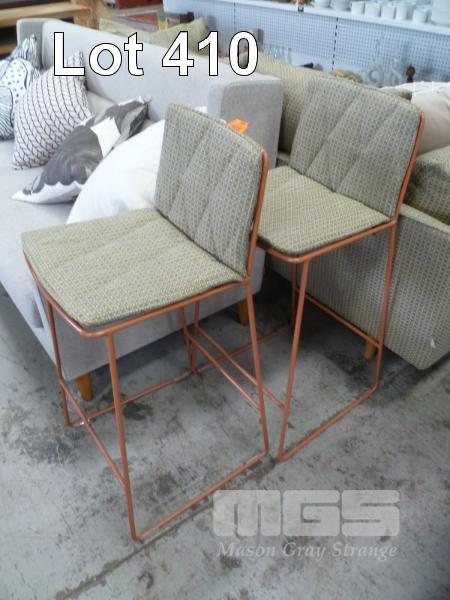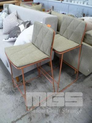 PAIR BROWN STEEL FRAMED OPEN WEAVE FABRIC UPHOLSTERED BAR STOOLS