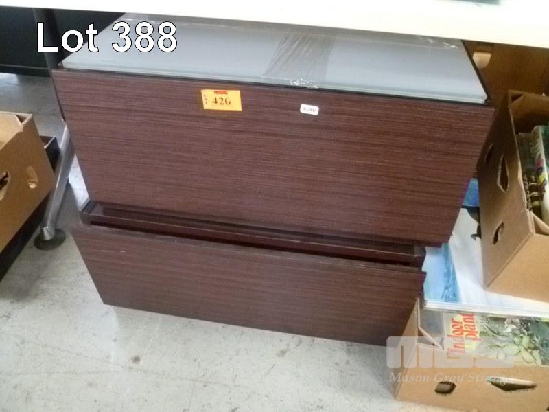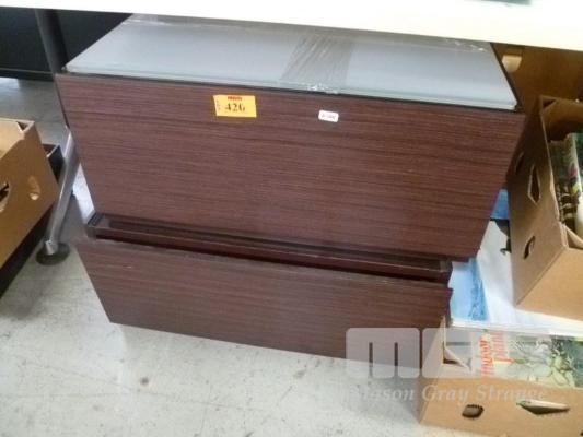 PAIR WOODGRAIN LAMINATE LOWLINE GLASS TOPPED DRAWER UNITS (1 x DRAWER - ALL FAULTS)