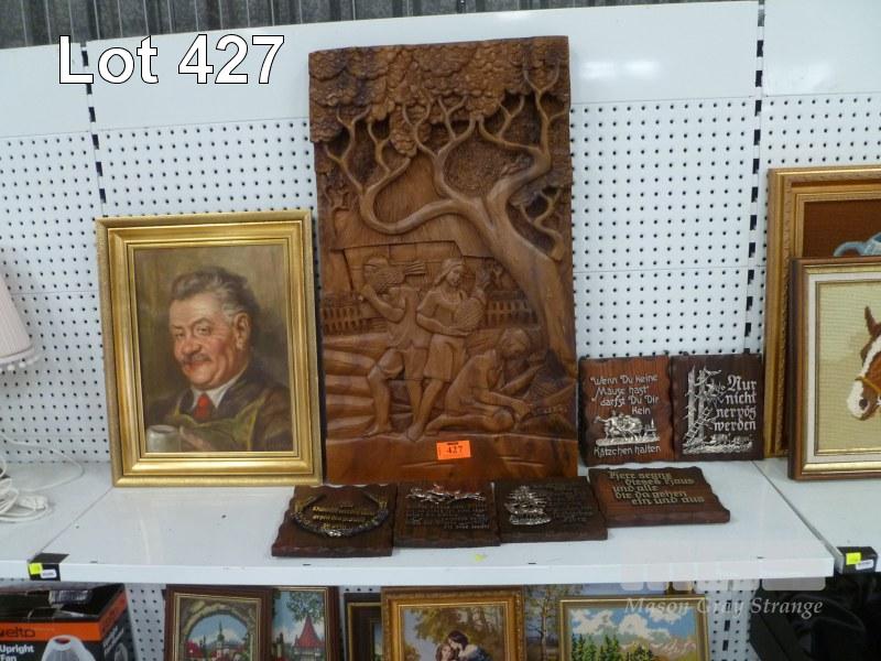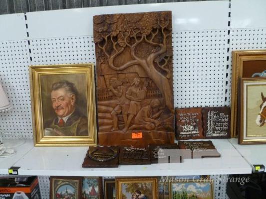 ASSORTED GERMAN WALL PLAQUES, BLACKFOREST CARVING & PAINTED PORTRAIT