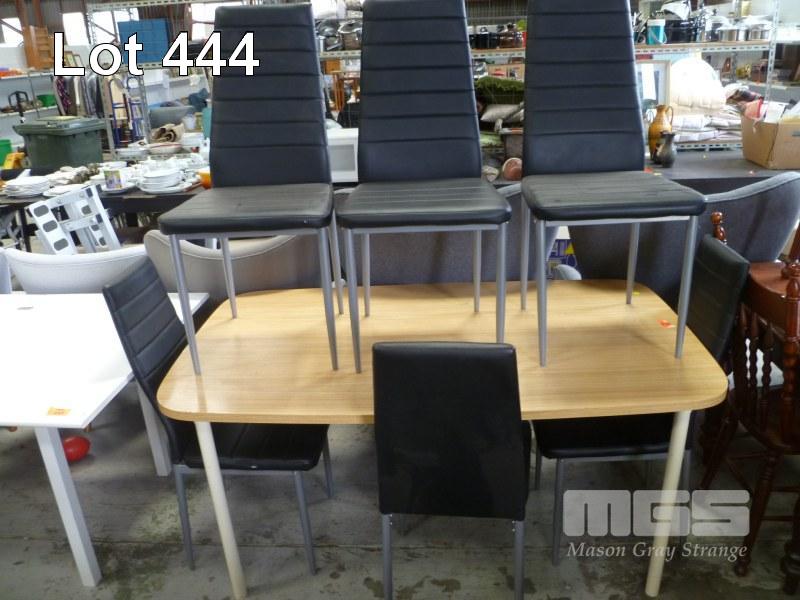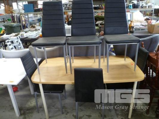 DINING SUITE, 7 PIECE, LAMINATE TOPPED TABLE WITH 6 X BLACK VINYL CHAIRS