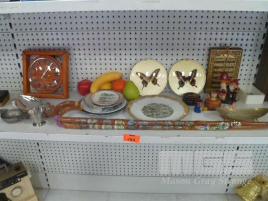 ASSORTED HOUSEHOLD ORNAMENTS, WALKING STICKS, BUTTERFLIES, WALL CLOCK