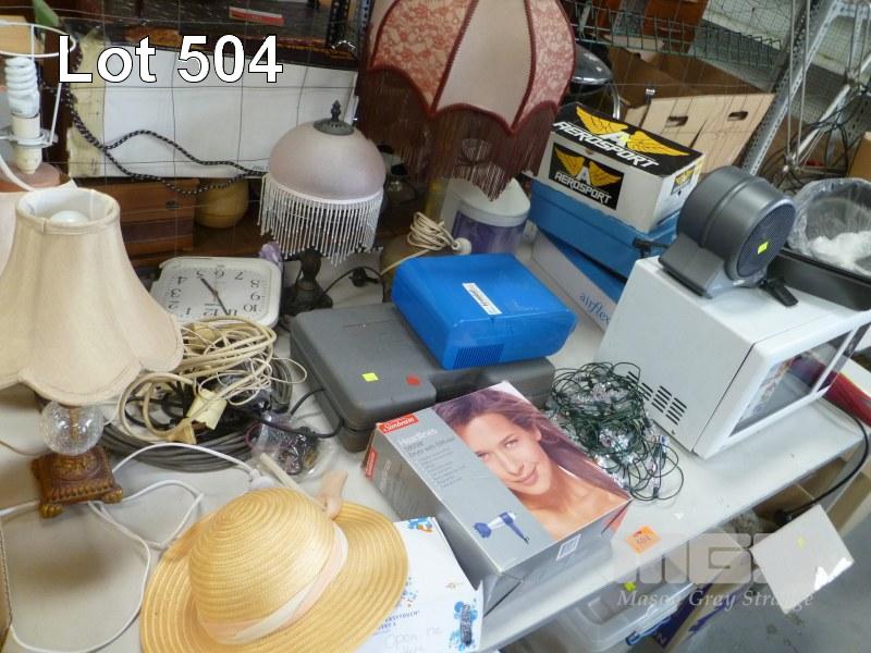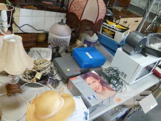 ASSORTED HOUSEHOLD & ELECTRICAL, LAMPS, HEATER, MICROWAVE, DRILL, HAIRDRYER, UMBRELLAS, LIGHTS, 3 x PAIRS SHOES (NEW)