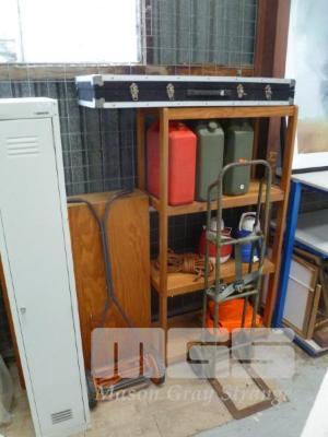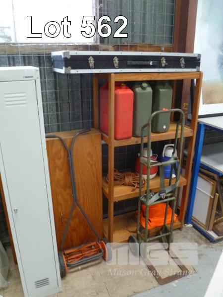 SHED LOT, SINGLE DOOR LOCKER, MOWER, TROLLEY, SHELF UNIT, JERRY CANS & 2 DOOR TOOL CUPBOARD