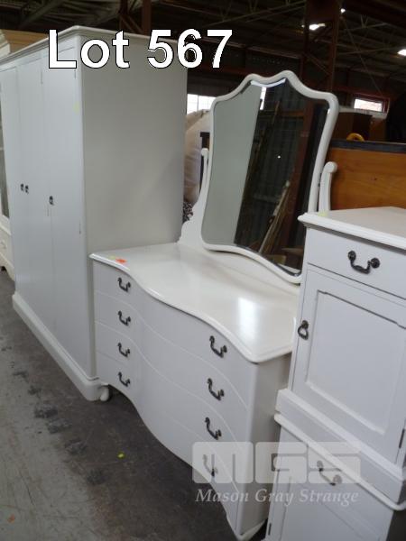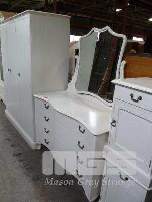 QUEEN ANNE STYLE BEDROOM SUITE, 3 DOOR WARDROBE, MIRROR BACKED DRESSER & PAIR OF BEDSIDE TABLES