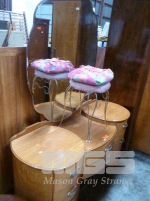 TIMBER VENEER DRESSER, 8 DRAWER, BEVEL MIRROR & STOOL