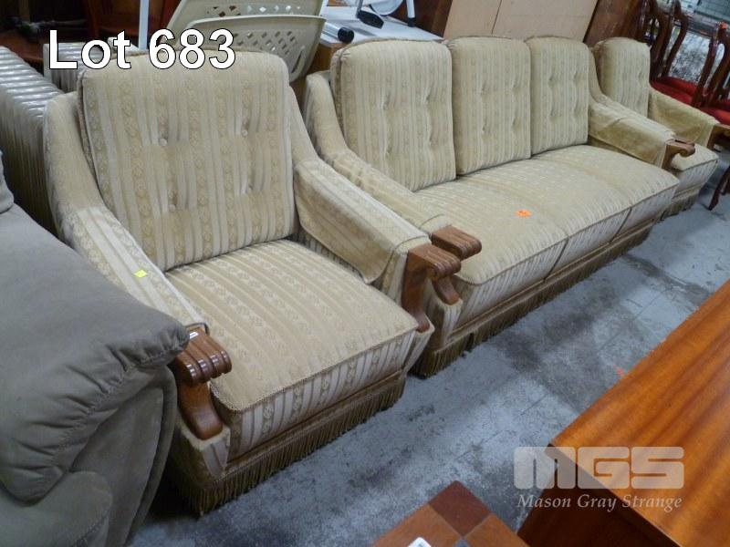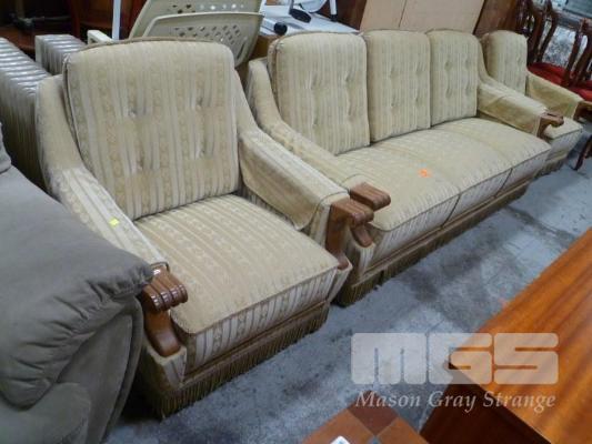 GOLD VELVET LOUNGE SUITE, 3 SEATER, 2 x CHAIRS, WITH EUROPEAN OAK ARM TRIMS