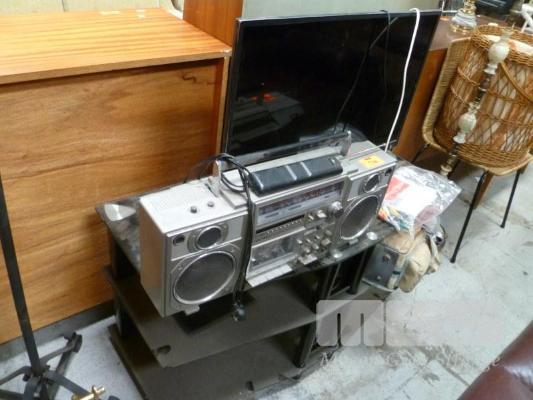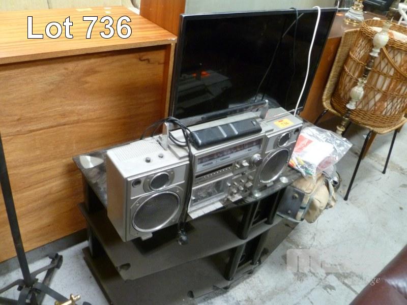 TCL 32" LCD TV, SANYO PORTABLE CASSETTE/RADIO & GLASS 3 TIER ENTERTAINMENT CABINET