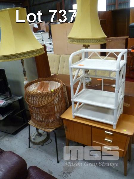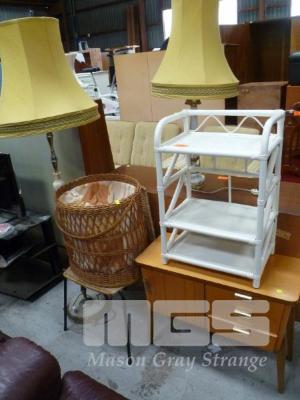 STANDARD LAMP, CANE CHAIR & BASKET, CANE SHELVES, 50's SIDE CABINET