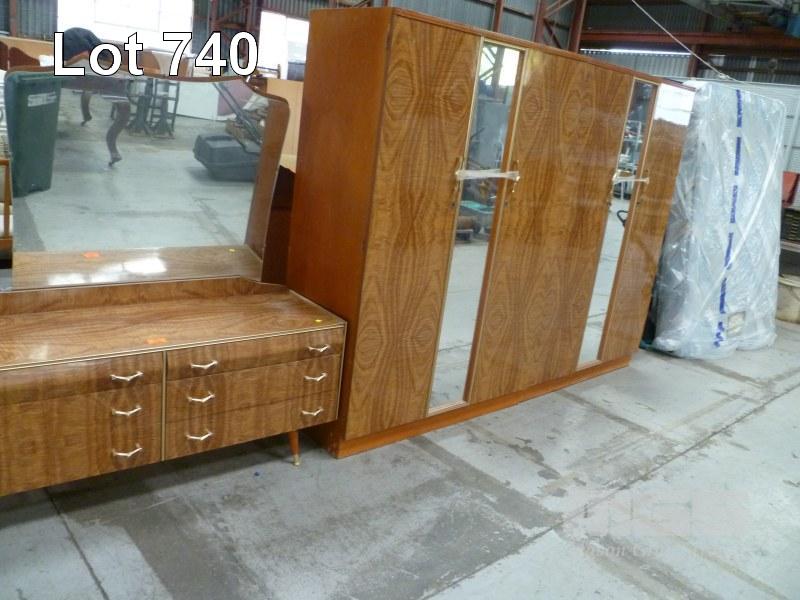 TIMBER LAMINATE 4 PIECE BEDROOM SUITE, DRESSER, 6 DRAWER, PAIR WARDROBES, 2 DOOR, DOUBLE BED WITH HEADREST (1 x DRAWER MISSING)