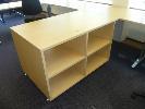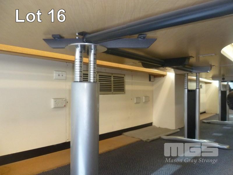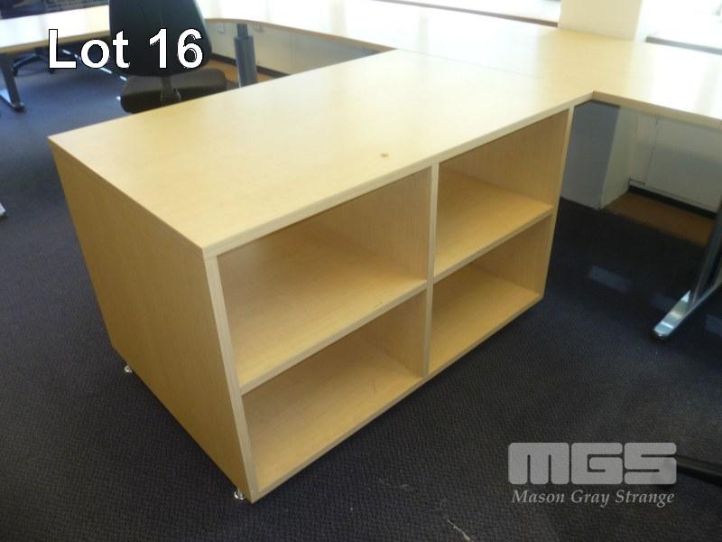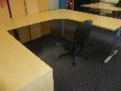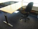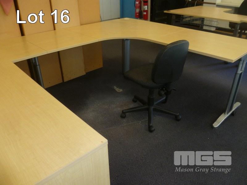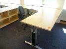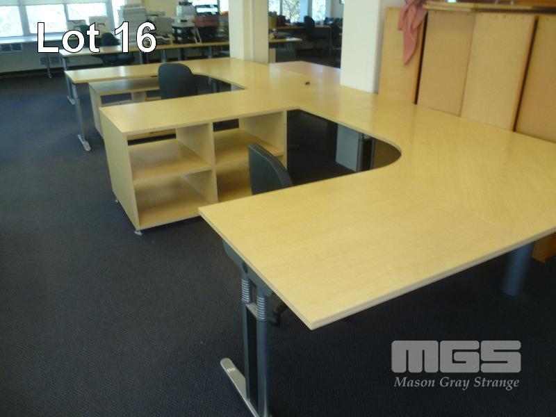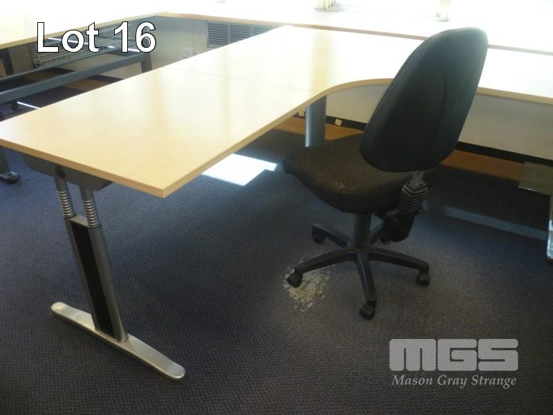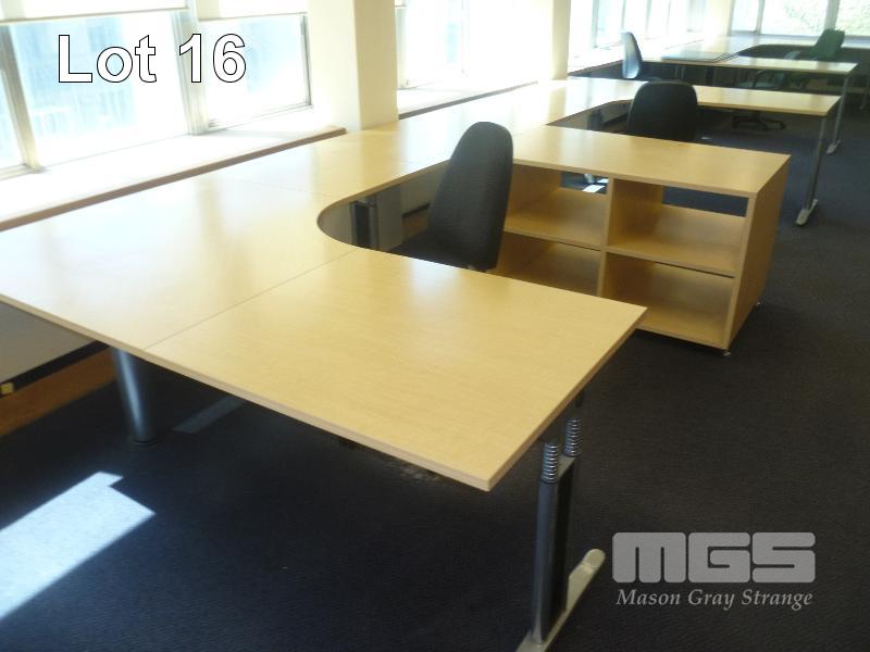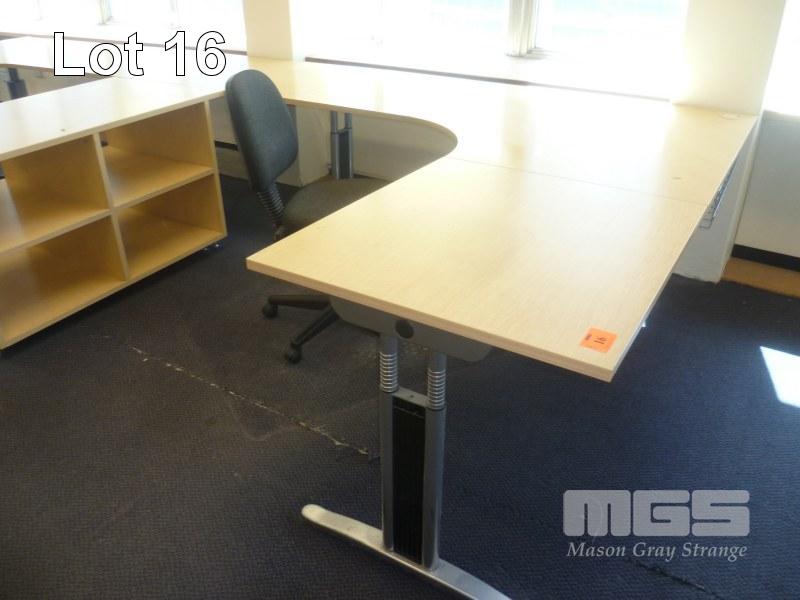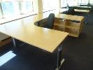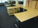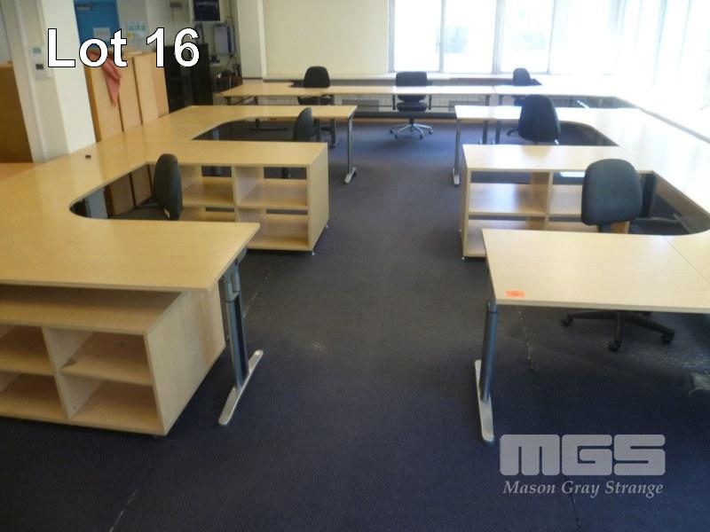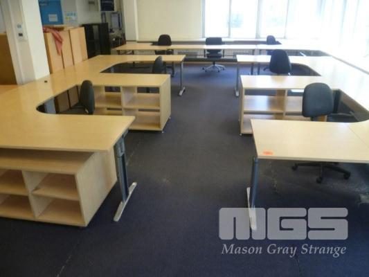 4 x CORNER OFFICE DESKS, ADJUSTABLE HEIGHT, YOUNG BEECH LAMINATE TOP, STEEL FRAME, 210 x 80cm WITH 2 x CENTRE SHELF UNITS, 4 x OFFICE CHAIRS