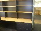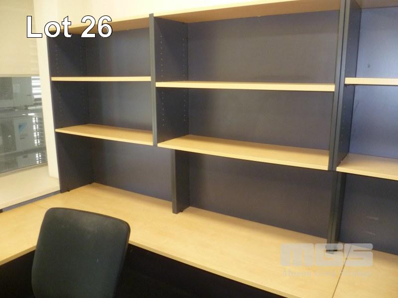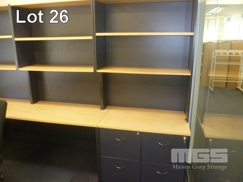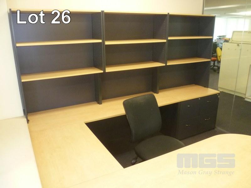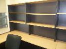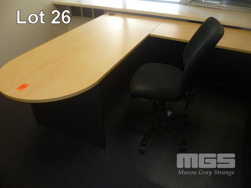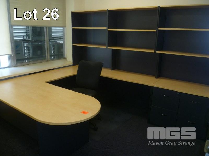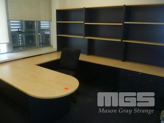EXECUTIVE OFFICE DESK, YOUNG BEECH / STORM LAMINATE, U-SHAPED, 200 x 80cm, LOWLINE 4-DRAWER FILING CABINET, SHELF UNITS, WITH OFFICE CHAIR & FLOOR MAT