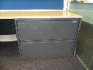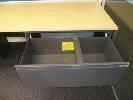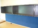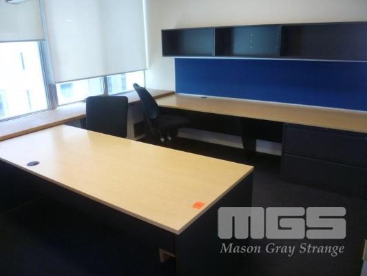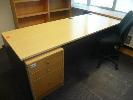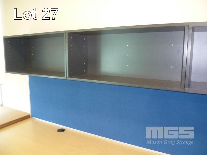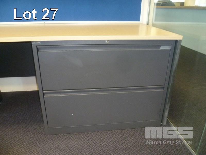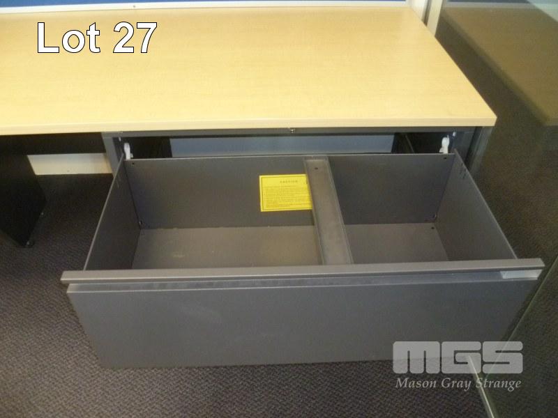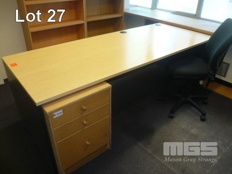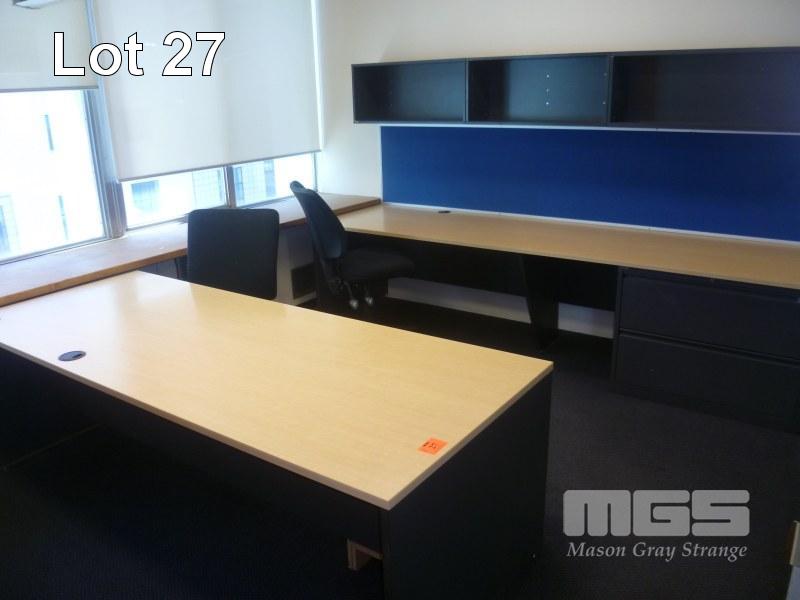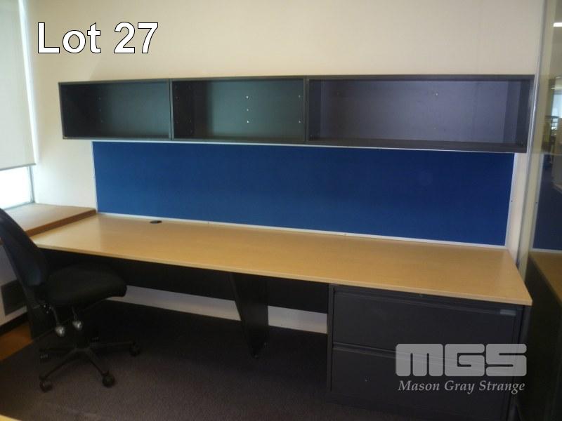 2 x OFFICE DESKS, YOUNG BEECH / STORM LAMINATE, EACH 225 x 90cm & 300 x 80cm WITH STEELCO 2-DRAWER LATERAL FILING CABINET, 2 x OVERHEAD SHELF UNITS, PINBOARD & 2 x OFFICE CHAIRS