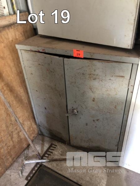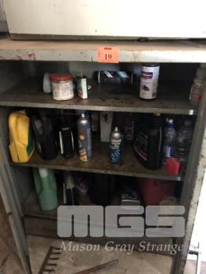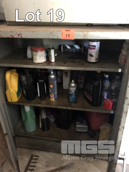LOWLINE 2 DOOR STEEL CABINET & CONTENTS, OILS LUBRICANTS ETC