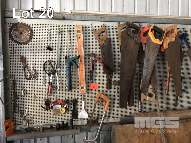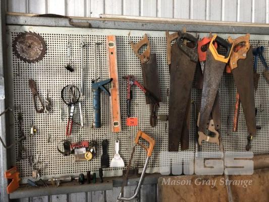 CONTENTS PEGBOARD, TOOLS, FIBRO CUTTER, LEVELS, SAWS, DRIVERS ETC