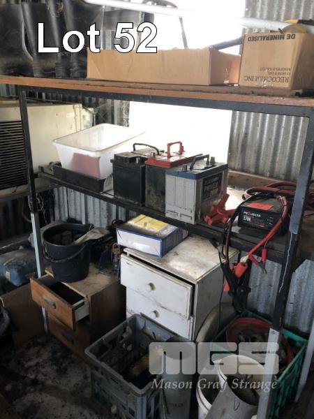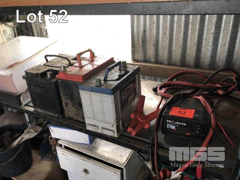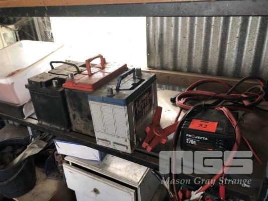 PROJECTOR BATTERY CHARGER & 3 x BATTERIES, DRAWER UNIT, PARTS ETC, WITH RACK