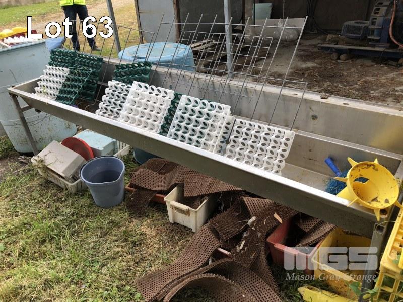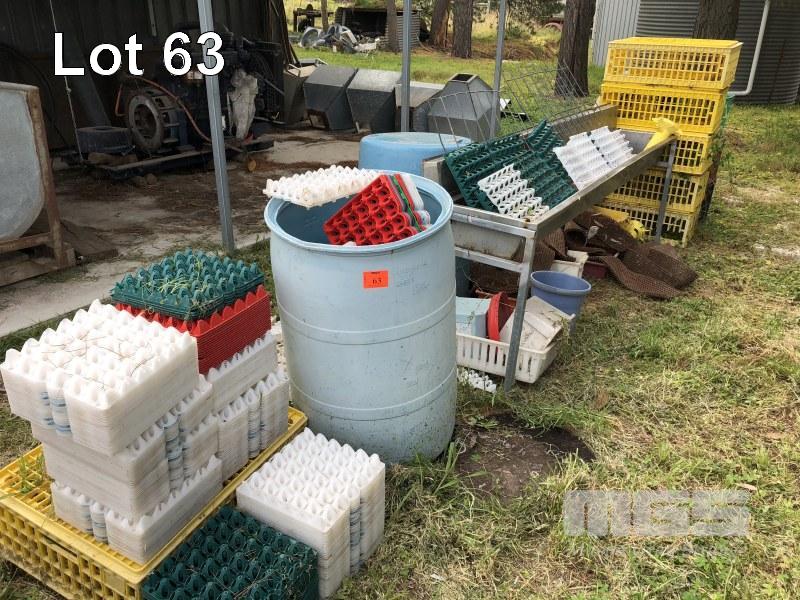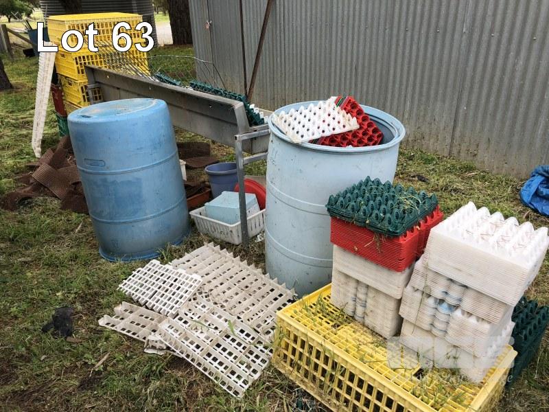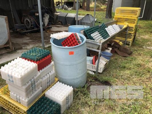 CHICKEN EGG DIVIDERS, PLASTIC CRATES, STAINLESS STEEL WASH TROUGH & 2 x 200 LITRE PLASTIC DRUMS