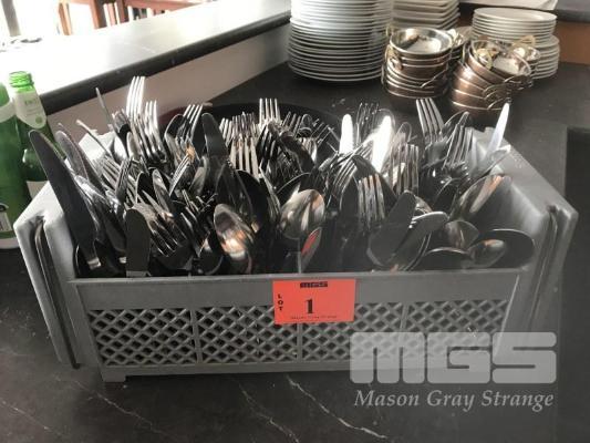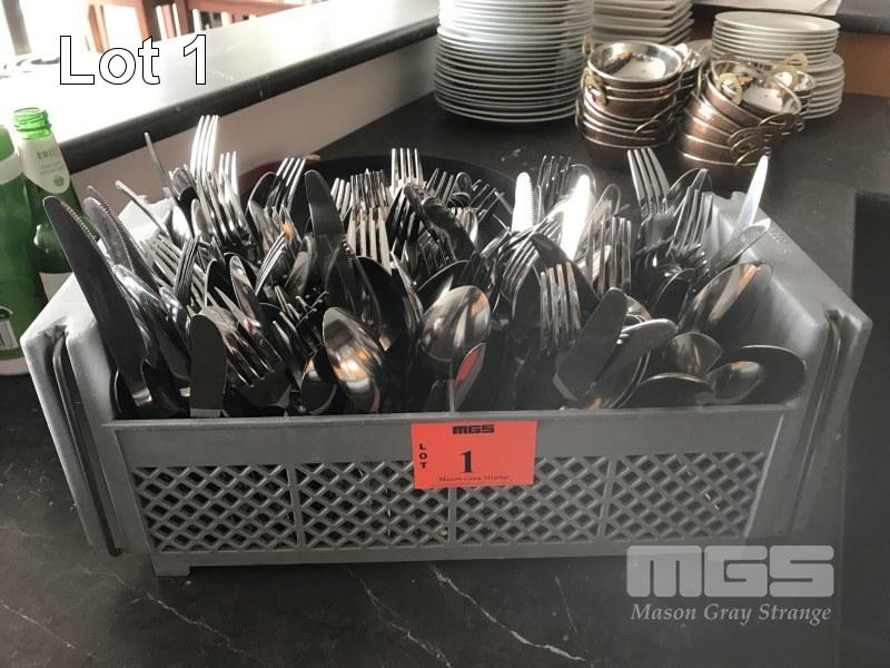 QUANTITY CUTLERY (APPROX x 50), KNIVES, FORKS, SPOONS & TRAY