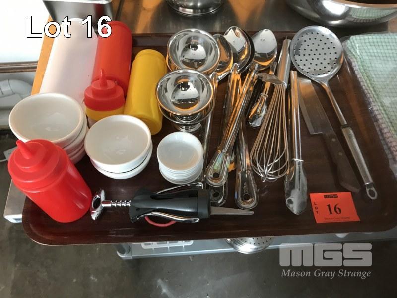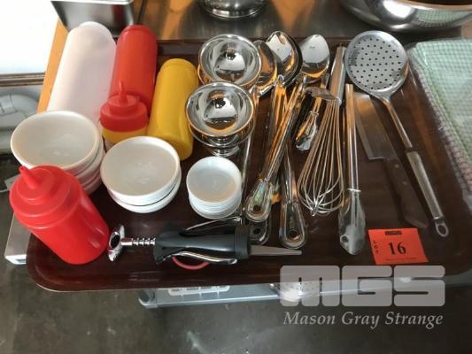 CONTENTS TRAY, LADLES & TONGS, STAINLESS STEEL BOWLS, CHINA BOWLS, SAUCES, CONDIMENTS & NEW DISH TOWELS
