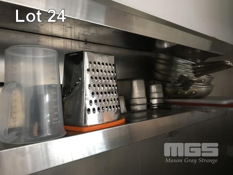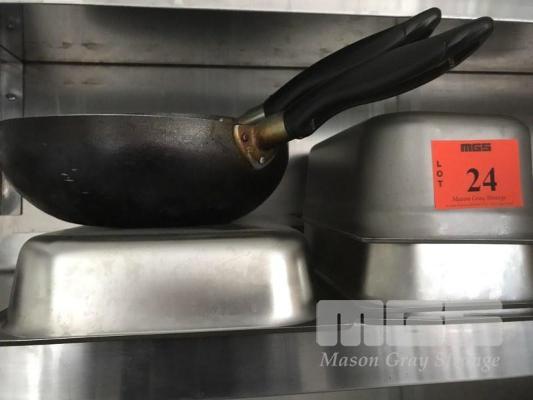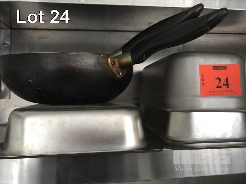 KITCHENWARE, POTS, FRY PANTS, STAINLESS STEEL TRAYS (1 x SHELF)