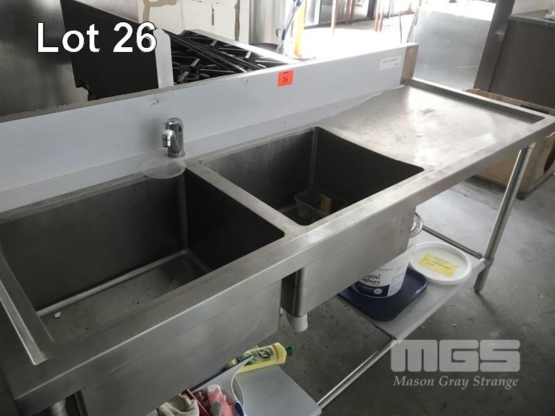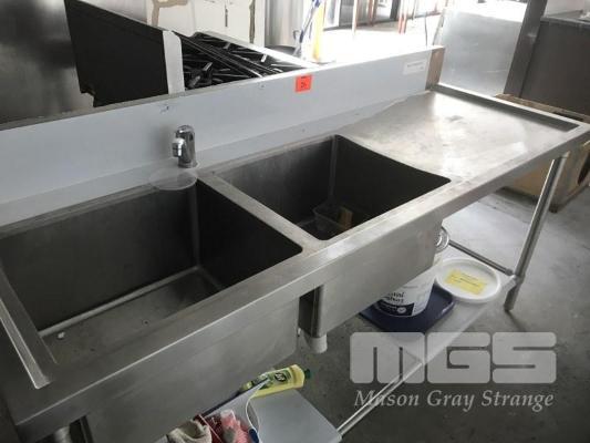 STAINLESS STEEL TWIN BOWL SINK (AS NEW), 1900 x 650mm WITH SPLASHBACK & UNDERBENCH SHELVING