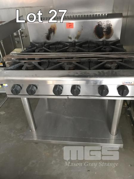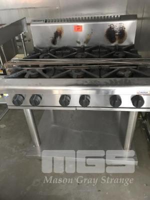 WALDORF 6 BURNER HOT PLATE UNIT, NATURAL GAS ON STAINLESS STEEL STAND, WITH SHELF