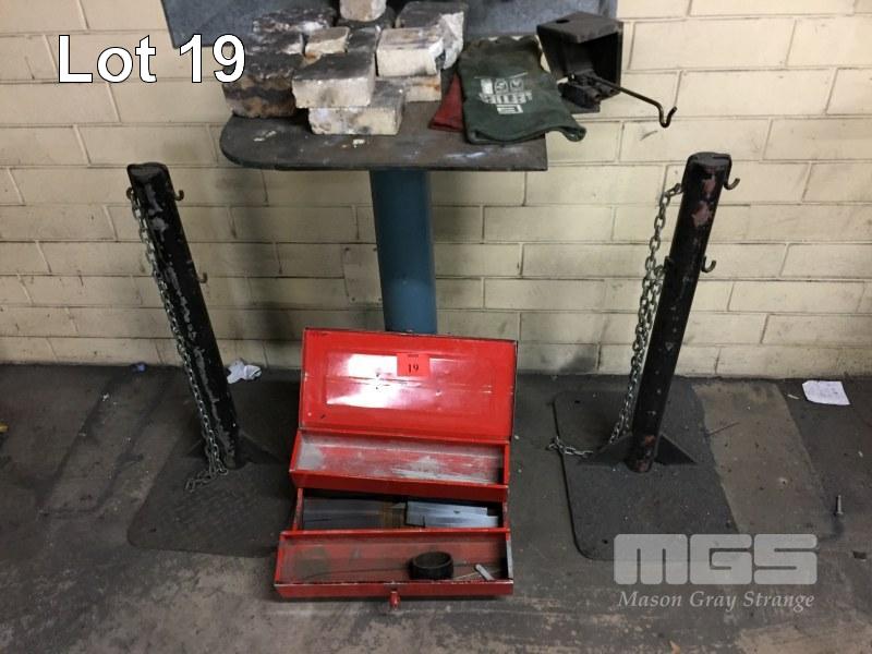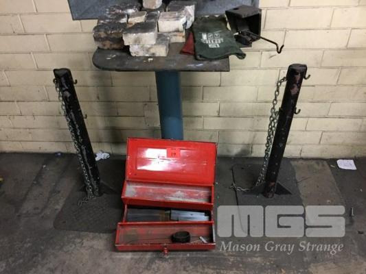 2 x GAS BOTTLE RACKS, BLACK & OXY CUTTING PEDESTAL WITH AUTO GAS CUT OFF & TOOL BOX