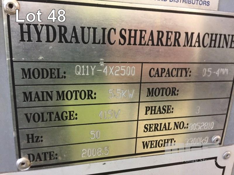HYDRAULIC GUILLOTINE MOD: QLLY-4X2500 S/NO: 8052810 DOM: 05/2008 CAP: 0.5-4.0mm MILD STEEL x 2500mm (L) WEIGHT: 2300kg 415V, 3 PHASE, 5.5kw PEDAL SWITCH & REAR GUARDING WITH MICRO SWITCH