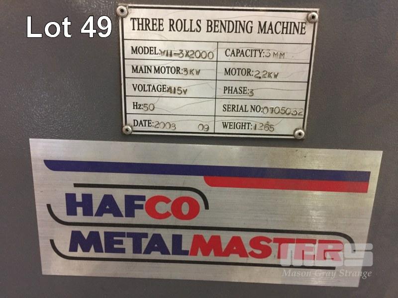 HAFCO SHEET METAL ROLLS, 3 ROLL SWING OUT TOP ROLL MOD: WH-3X2000 S/NO: 0705032 DOM: 03/2009 3mm CAPACITY, MILD STEEL 2000mm (L), 130mm (D) ROLLS 415V, 3 PHASE, 2.2kw FITTED WITH ES