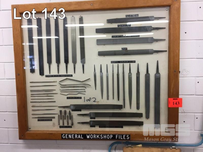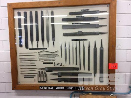 WALL DISPLAY, TIMBER & GLASS WITH CONTENTS APPROX 50 x (AS NEW) FILES, RASPS & BURS PLUS TIMBER WALL-MOUNT TOOLBOX, RULERS, SQUARES, HAMMERS & MORE