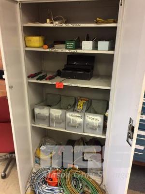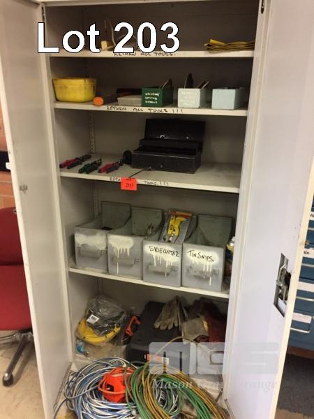 CONTENTS OF CUPBOARD, TIN SNIPS, RIVET GUN, PLIERS, CLAMPS , EXTENSION CORDS , GLOVES , HEAVY HAMMER , SAFTEY SHIELD.