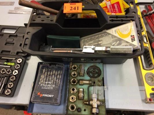 STANLEY TOOL TRAY & CONTENTS, HAMMERS 1/4 DRIVE SOCKETS, RIVETER, TENSION WRENCH & DRILL SET