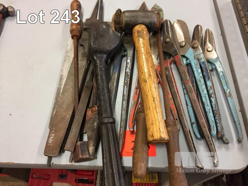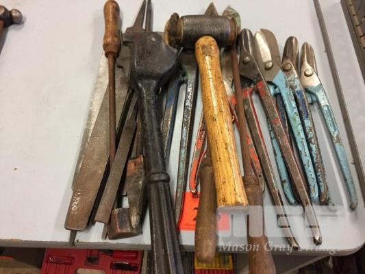 QUANTITY TIN SNIPS, HAMMER, FILES, SOLDERING IRONS