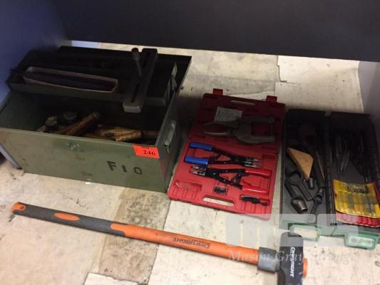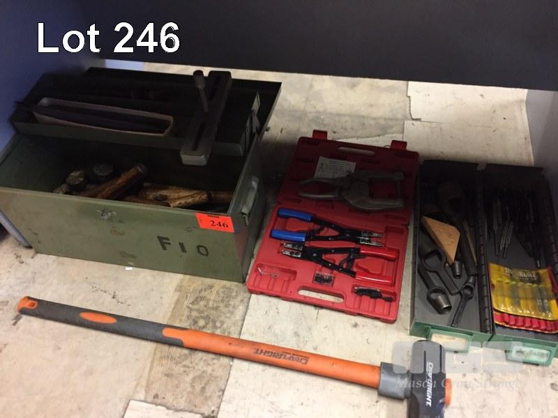 TOOLBOX & CONTENTS, HAMMERS, FILES, SLEDGE HAMMER, CIRCLIP PLIER SET, WAD PUNCH, STONE DRESSING TOOL