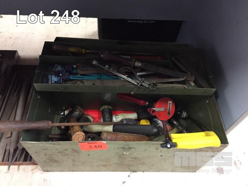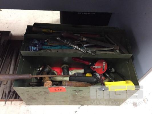 TOOLBOX & CONTENTS, HACK SAW , HAMMERS, DRILLS, MICROMETER, DRIVERS, CALIPERS, FILE CARD