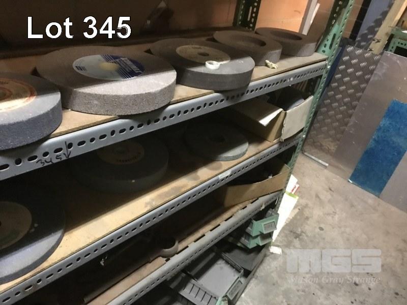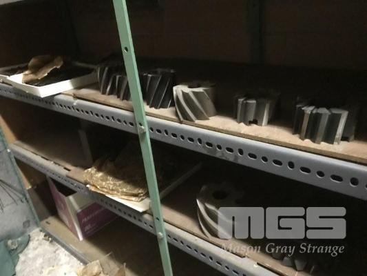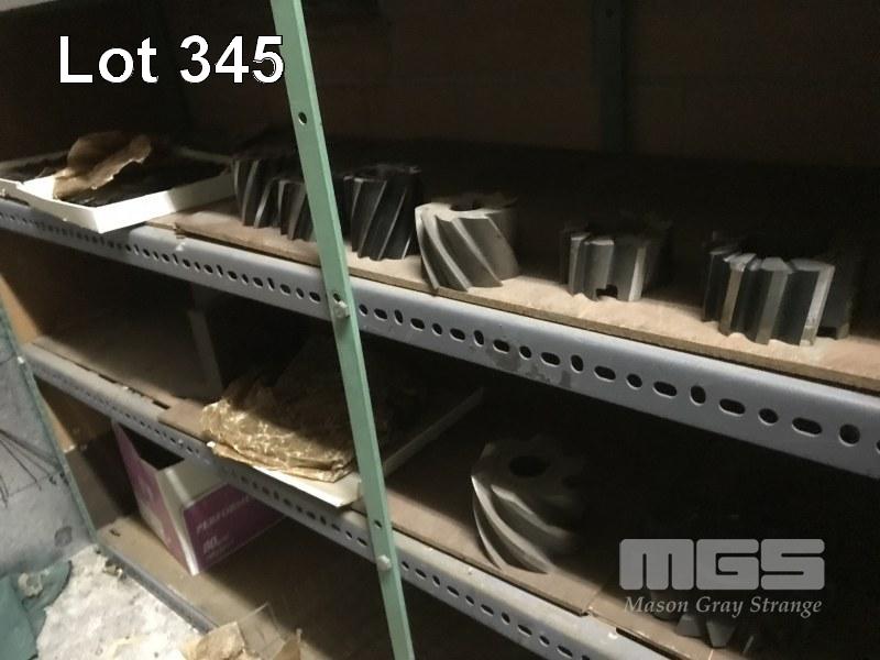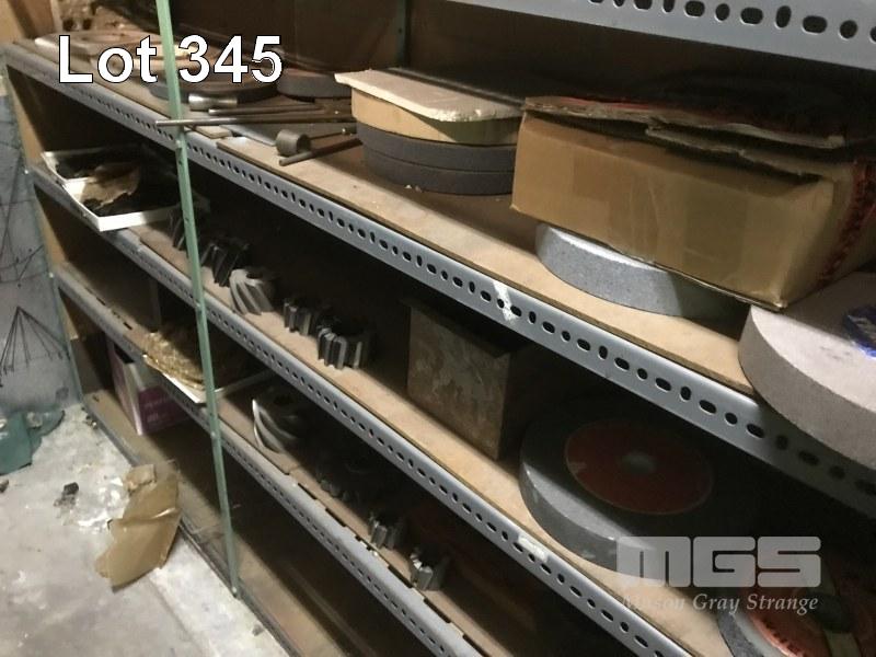 CONTENTS BOTTOM 4 SHELVES OF RACK, LARGE QUANTITY MILLING CUTTERS, GRINDING STONES ETC