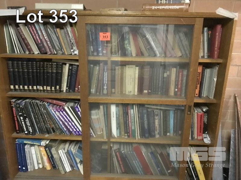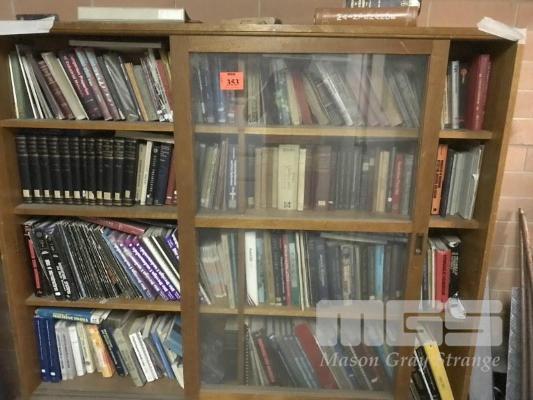 TIMBER BOOKCASE, 2 x SLIDING GLASS DOORS, 1600 x 1350mm WITH CONTENTS, HUGE QUANTITY ENGINEERING MANUALS (OVER 200 x BOOKS), MEASUREMENTS, DIE MAKING DESIGN & MORE