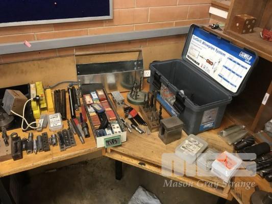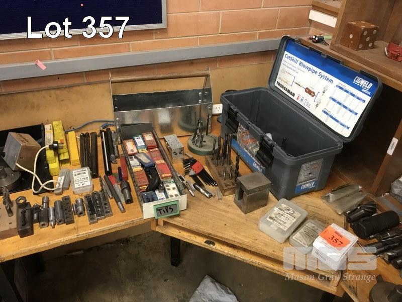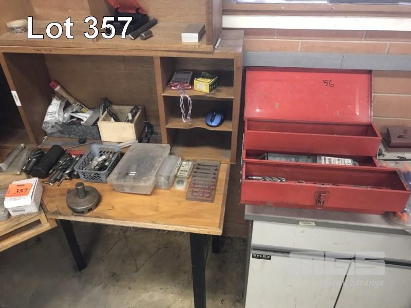 CONTENTS TOP OF DESK, CARBIDE TIPS, DRIVE DOGS, MILL CUTTERS, TOOLBOX, TAPS & MORE