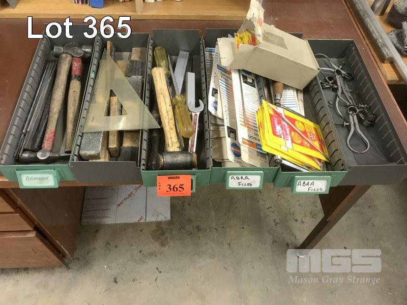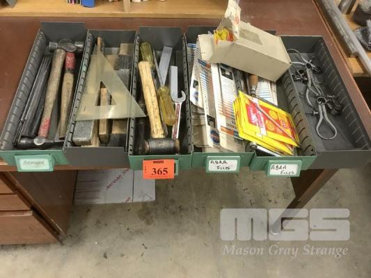 6 x TRAYS ASSORTED HAND TOOLS, HAMMER FILES, CALIPERS, RULERS ETC