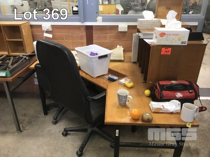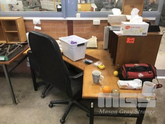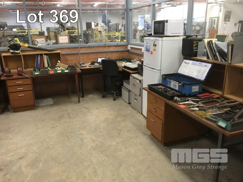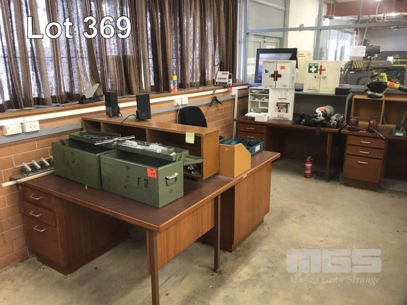8 x DESKS, LOWLINE CUPBOARD & 2 DRAWER FILING CABINET