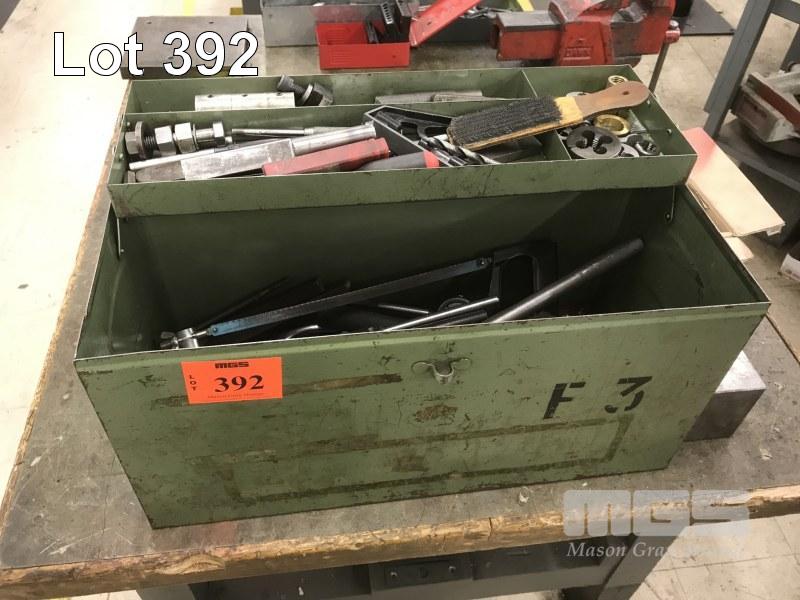 TOOLBOX & CONTENTS, TAP WRENCHES, DIE HOLDER, DIES, TAPS, HACKSAW, HAMMERS & MORE