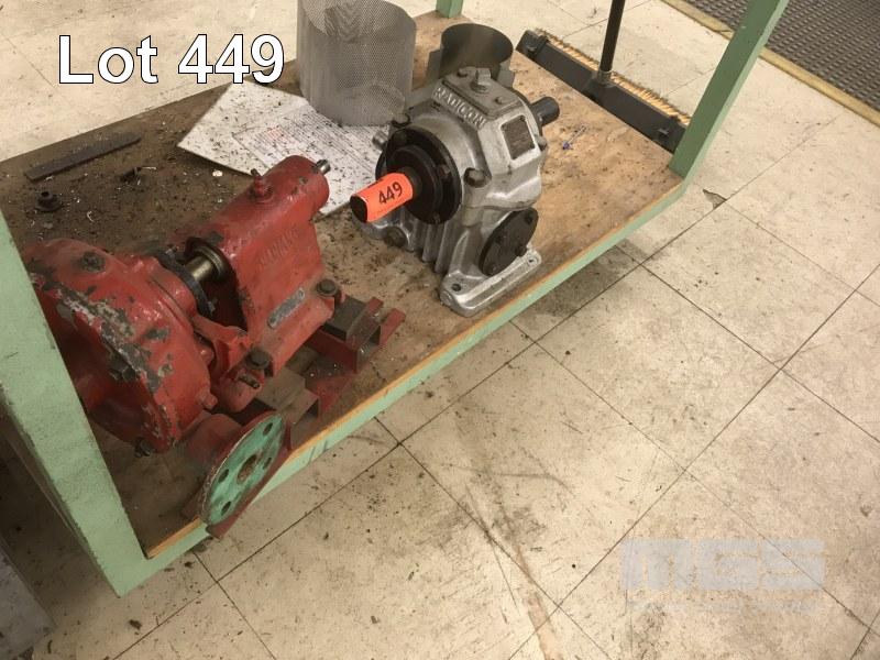 RADICON REDUCTION DRIVE, HARLAND PUMP & 2 x WORKSHOP TROLLEYS