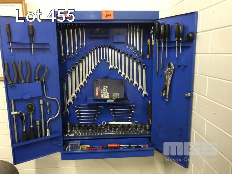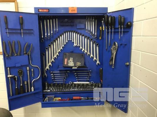 KC PRO AM WALL MOUNT TOOL CHEST & CONTENTS:- METRIC & IMPERIAL, RING SPANNERS, OPEN END SPANNER, SOCKET SET, HEX KEYS, VICE GRIPS, DRIVERS, PLIERS, 900 x 660mm CABINET