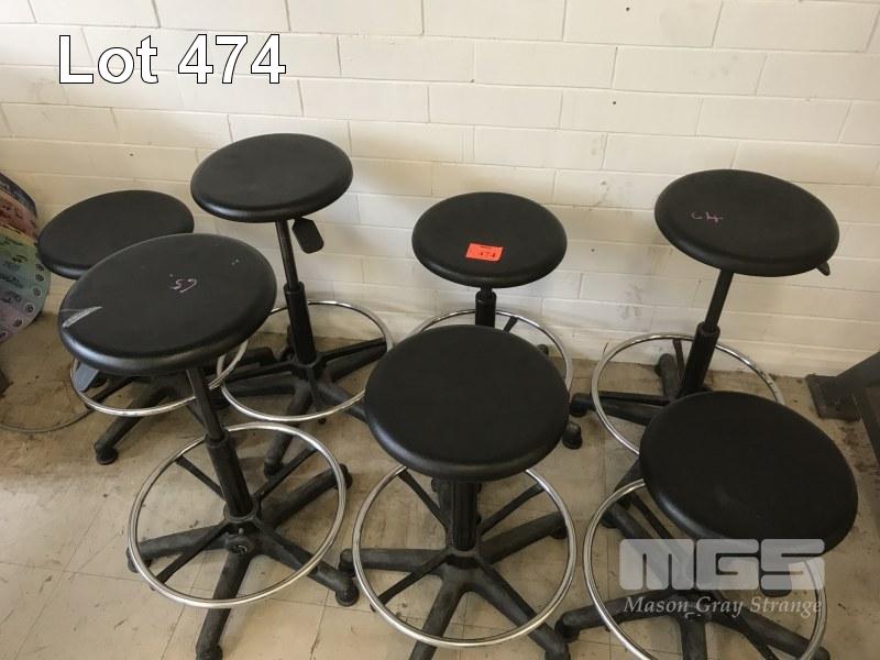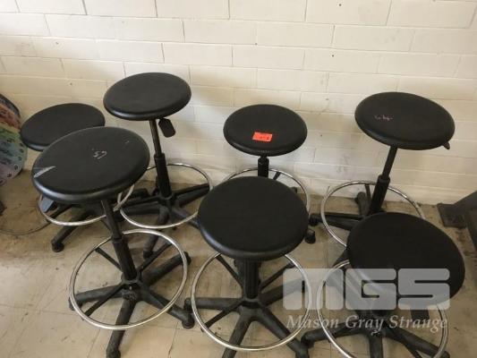 7 x WORKSHOP STOOLS, RISE AND FALL, STEEL CHROME FRAME, BLACK, ROUND, VINYL TOP