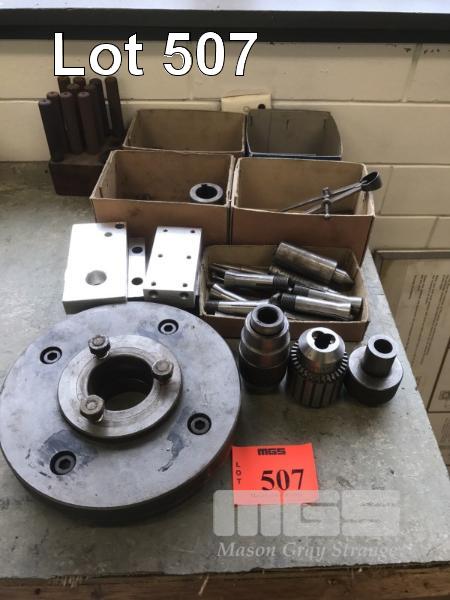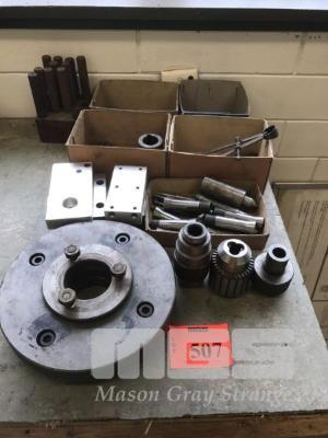 ASSORTED COLLETS, CHUCKS, BACK PLATE, DRILLS, CALIPERS