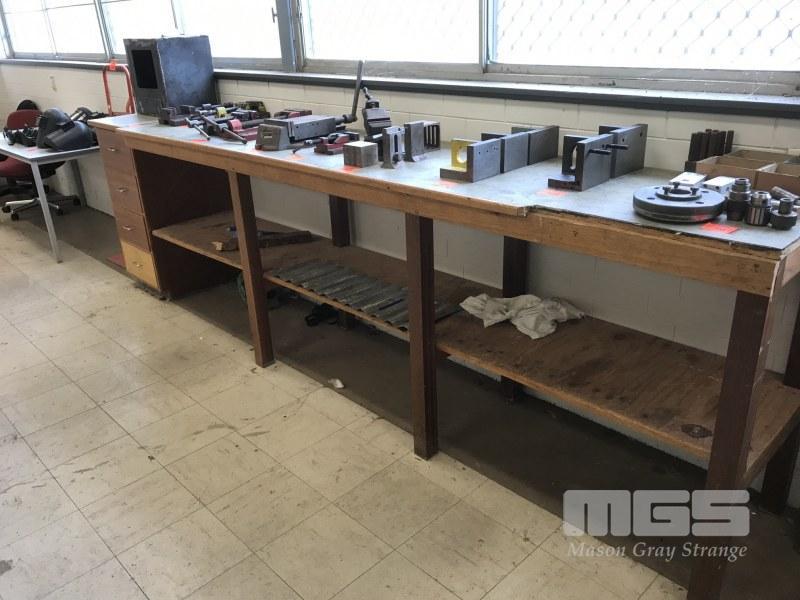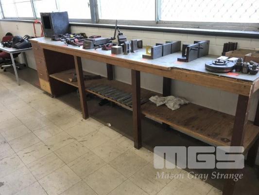 2 x STEEL FRAME & TIMBER TOP TABLES (3200 x 800mm & 1500 x 750mm) WITH TIMBER 4 DRAWER UNIT & SHELF UNIT