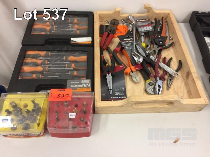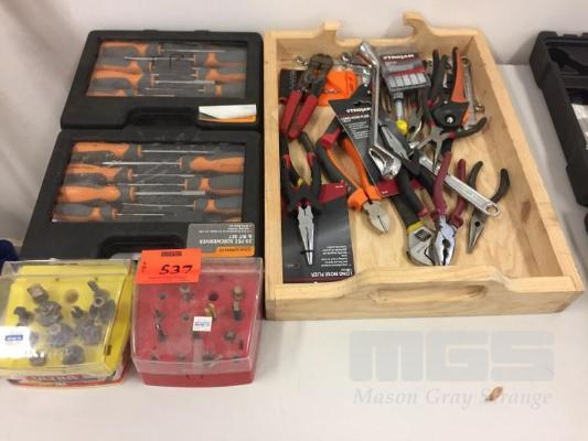 ASSORTED HAND TOOLS, PLIERS, SHIFTERS, CUTTERS, ROUTER BITS & 2 x DRIVER SETS